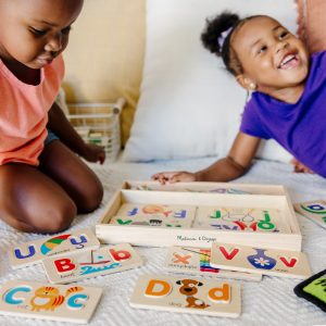 ABC. tell me what you see! These adorably illustrated boards are a great way to work on letter and word recognition; a child simply picks a board–the first letter of his or her name is always a good place to start–then fills in the uppercase and lowercase letters and identifies the picture. He or she can turn it over or take another board and do it all again. With so many letters (each letter in the alphabet in both uppercase and lowercase). children can find infinite ways to play!