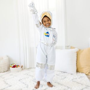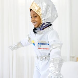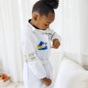 Houston. we have a costume. Kids will be over the moon when they get to step into the jumpsuit. slip on the stretchy silver gloves. and top it all off with the shiny helmet! There’s even a reusable nametag that proudly IDs your little space explorer. then wipes clean so another astronaut can have a turn. This durable role play set is suitable for ages 3 – 6 and ready for any mission. whether it’s piloting an imaginary rocket. exploring the distant galaxies at the other end of the house. or just striding dramatically toward your spaceship. Made of sturdy materials and built to last. the entire set is machine washable too!