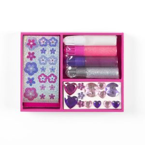 This Melissa & Doug wooden jewelry box is a craft kit and keepsake all in one! Kids can add their own creative touches and personalize this Created by Me jewelry box and use it to store their jewelry and special little items. The sturdy wooden box is constructed of high-quality. durable wood. and features a mirror inside the lid as well as a velvet ring holder. The all-inclusive craft kit features everything kids need to decorate the pretty pink box. It includes 26 sparkling gem stickers. 38 shimmering foil stickers. three glitter glue sticks and a white glue stick. Decorating the jewelry box isn’t just fun…it helps promote fine motor skills. hand-eye coordination. and creative expression. The Jewelry Box Wooden Craft Kit is a wonderful toy for kids as an individual project or a party activity and favor. It makes a great gift for kids ages four and older. for hands-on. screen-free play.