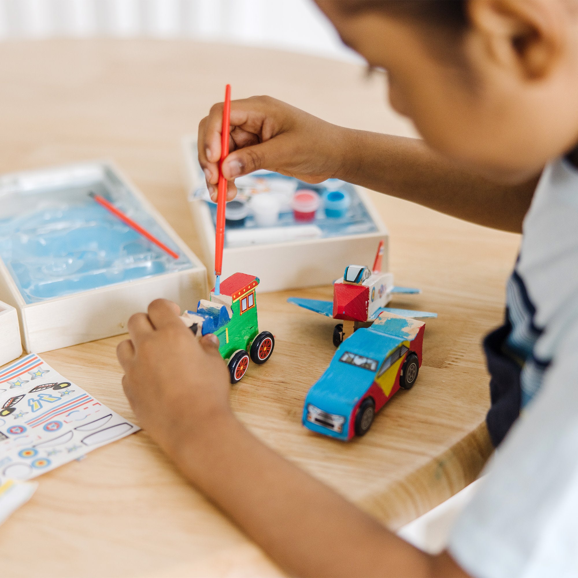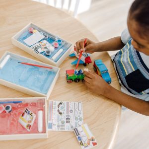These cool vehicle kits contain everything you need to assemble and decorate a race car. train. and jet plane. Attach the axles and wheels. then add custom details with the included brush. paints. and stickers. Great gifts or rainy-day activities. these cool little kits bring big horsepower to arts-and-crafts time! Melissa & Doug products provide a launch pad to ignite imagination and a sense of wonder in all children so they can discover themselves. their passions. and their purpose.