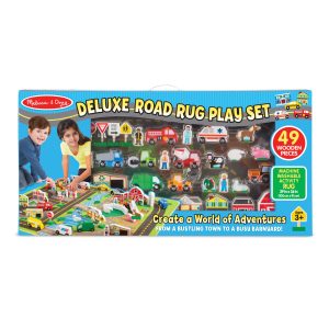 Create a world of adventures. from a bustling town to a busy barnyard! This deluxe play set includes a soft and durable machine-washable activity rug. and 49 wooden play pieces to bring it to life. Pieces include construction vehicles. cars and trucks. play people. buildings. farm equipment and structures. animals. traffic signs. and more! The soft 39-inch by 36-inch (100 cm by 91 cm) rug with skid-proof backing and reinforced border binding has room for multiple kids to play. Countless imaginative adventures await!