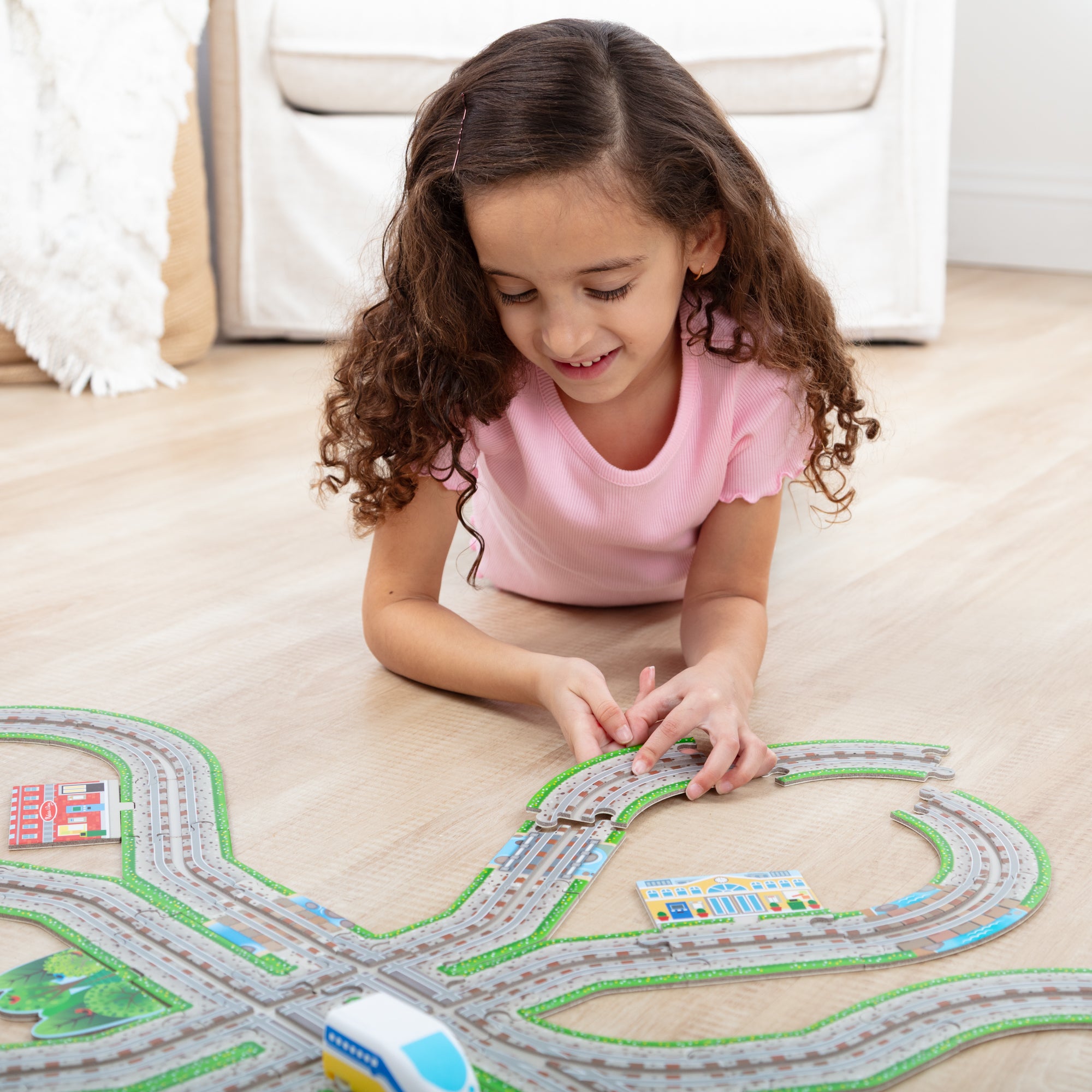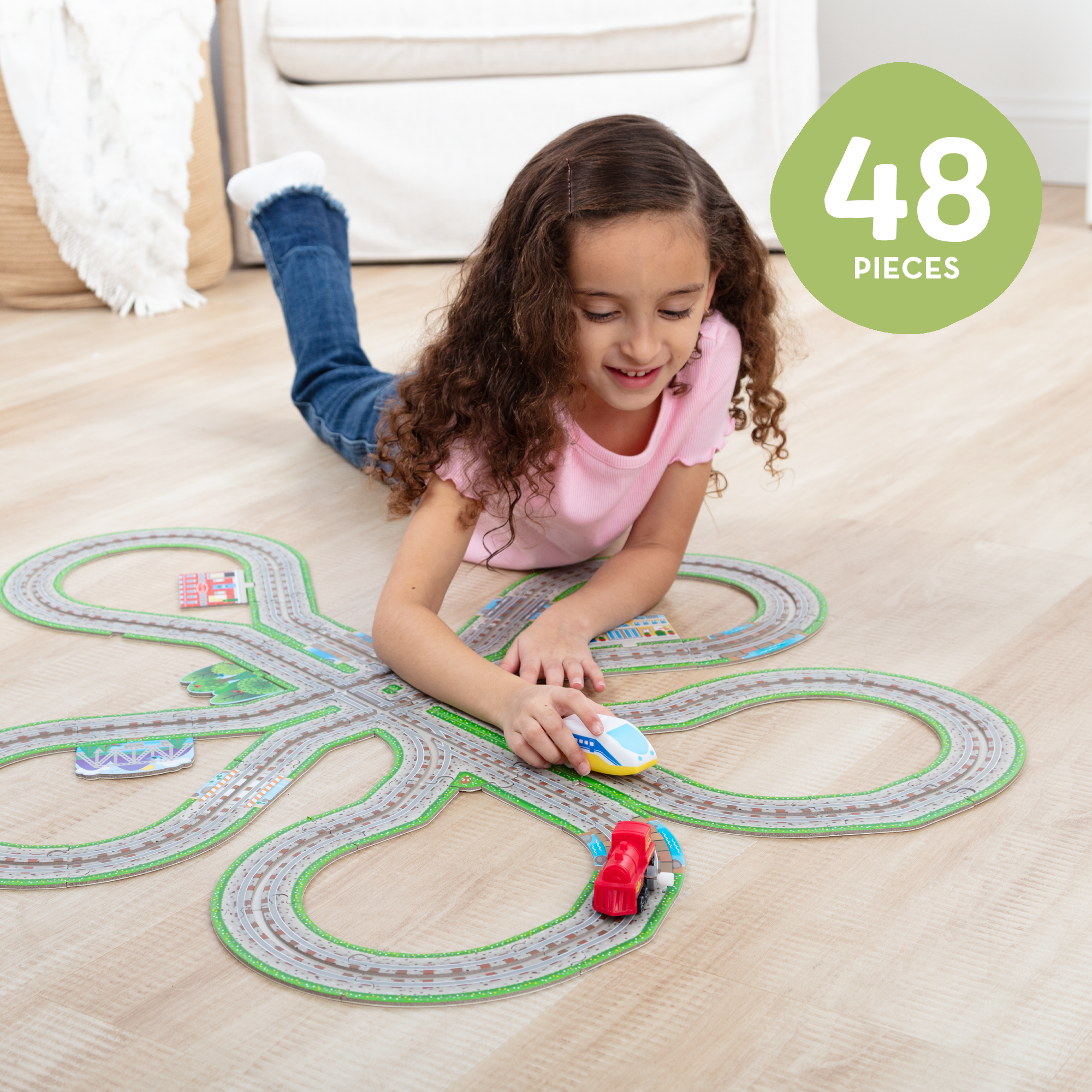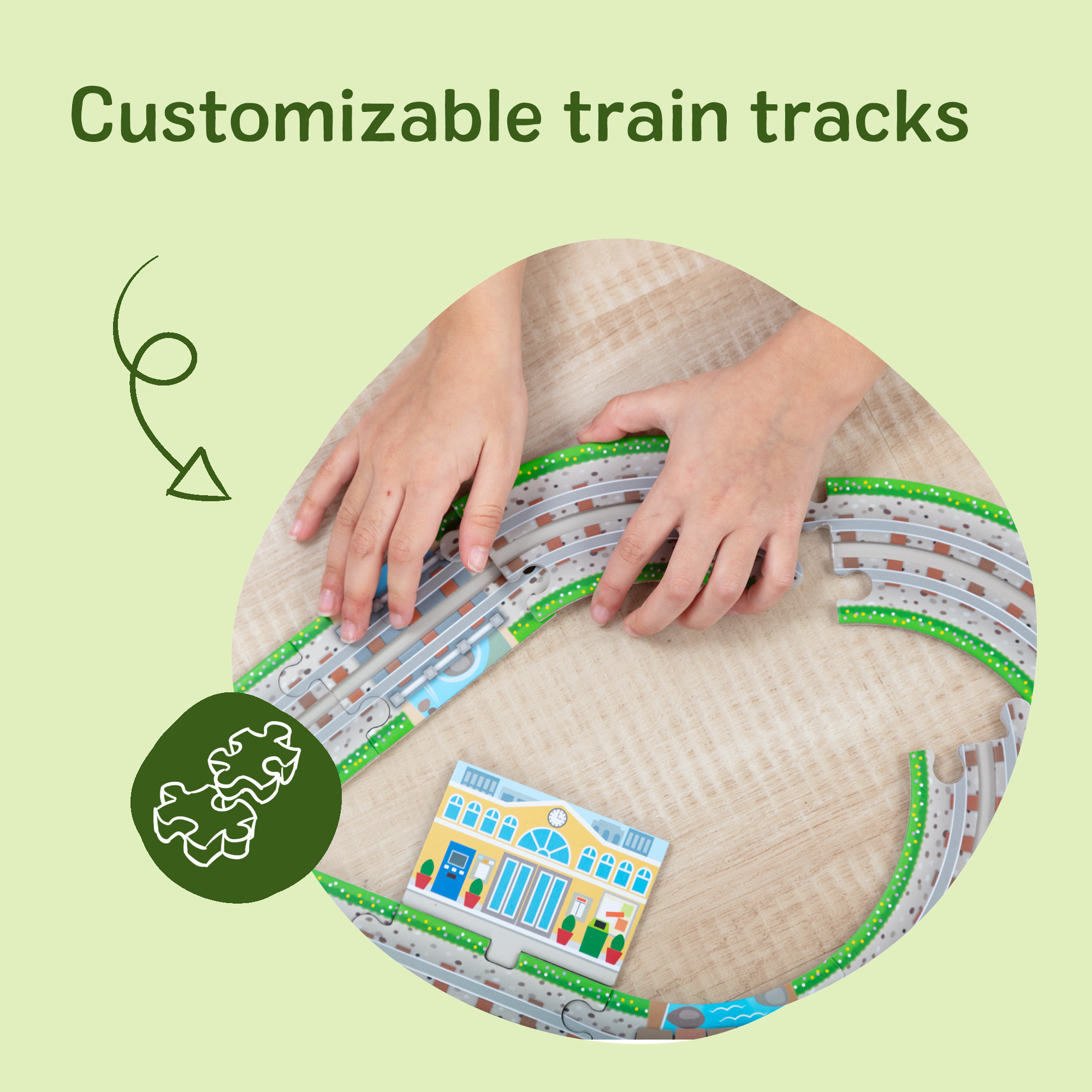 Choo-choo! All aboard for a fun-filled adventure with the Melissa & Doug Design Your Own Railroad Floor Puzzle. This engaging set invites kids to piece together 48 sturdy cardboard jigsaw puzzle pieces. each featuring built-in tracks to design their own railroads. The grooves in the pieces form twisting and turning train tracks. creating a fun path for the two included wind-up toy trains – a traditional locomotive and a speed train. Children can wind them up and watch as they zoom along their custom track designs. With up to 20 feet of track and four add-on scenery pieces that attach for pretend play. this toy encourages creativity and problem-solving through thrilling sensory play. A screen-free rail-building activity for birthdays. holidays. or at-home play for kids ages 4+. offering track design. train motion. and open-ended setups across multiple configurations. For even more meaningful developmental play. combine this with other Melissa and Doug pretend play toys for kids that love preschool learning activities like jigsaw puzzles. & games like the Secret Decoder Deluxe Activity Set & the Hungry Pelican. for endless learning adventures. For 35+ years. Melissa and Doug has crafted imaginative preschool toys and durable wooden toys built to nurture childhood wonder. with everything from a life-sized grocery store playset to a play kitchen playset and play food to serve plush toys & puppets. to costumes. arts & crafts. and road trip activities for kids. It’s the kind of kid-powered play that builds independence and confidence! This product is certified by the Forest Stewardship Council. FSC certification ensures that products come from responsibly managed forests that provide environmental. social. and economic benefits. and that forests are protected for future generations. Please note that FSC certification applies to new inventory only (FSC C156584)