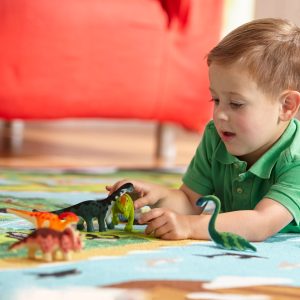 These prehistoric pals are the life of any dinosaur party! This collection of 9 realistic felt-covered miniature models of prehistoric creatures includes some of the most recognized and popular species. ranging from the small but super-swift Velociraptor. to the king of the dinosaurs. T-Rex. to the gentle giant Apatosaurus. The dinosaurs store in individual labeled compartments in a sturdy wooden storage tray. Information on all the species is included. Kids three and older will love to play with. learn about. and bring to life giants who walked the earth millions of years ago!