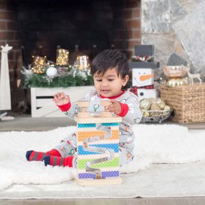 Get the fun rolling with this sturdy wooden tower and four pieces that spin down the zig-zag track! Babies and toddlers 12 months and older will delight in matching. stacking. and rolling the smooth. solid wood pieces with friendly safari animal faces that store right in the tower when it’s turned sideways. First Play toys feature bright colors. bold patterns. and whimsical designs that boost skills while sparking imagination and wonder—right from the start!