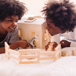 It’s a natural! With a decorative green shingled roof. this wooden stable provides a happy home for four plastic horses. When open. your little farmer or equestrian has easy access to the hayloft. with its wooden ladder and four bales of hay. There’s a stall for each of the four included horses. lots of sliding and swinging doors and a folding corral to keep the horses in the barnyard. Four horses included.