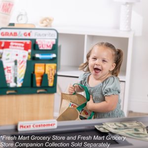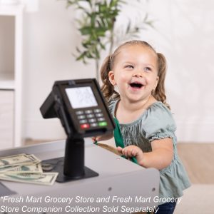Shopping and playful purchasing is exciting at the sturdy wooden Fresh Mart Grocery Store! The free-standing play space with smooth. curved corners and edges lets customers three and older browse the shelves and pay for purchases on one side. and allows the grocer to ring up items on the other. Realistic features include beeping scanner. a hand-crank conveyor belt. a card-swiping machine. a keypad/calculator. and cash drawer. Styles and colors may vary. Kids are sure to find everything on their shopping list at this friendly neighborhood grocery store! This product is certified by the Forest Stewardship Council. FSC certification ensures that products come from responsibly managed forests that provide environmental. social. and economic benefits. and that forests are protected for future generations. Please note that FSC certification applies to new inventory only (FSC C156584)