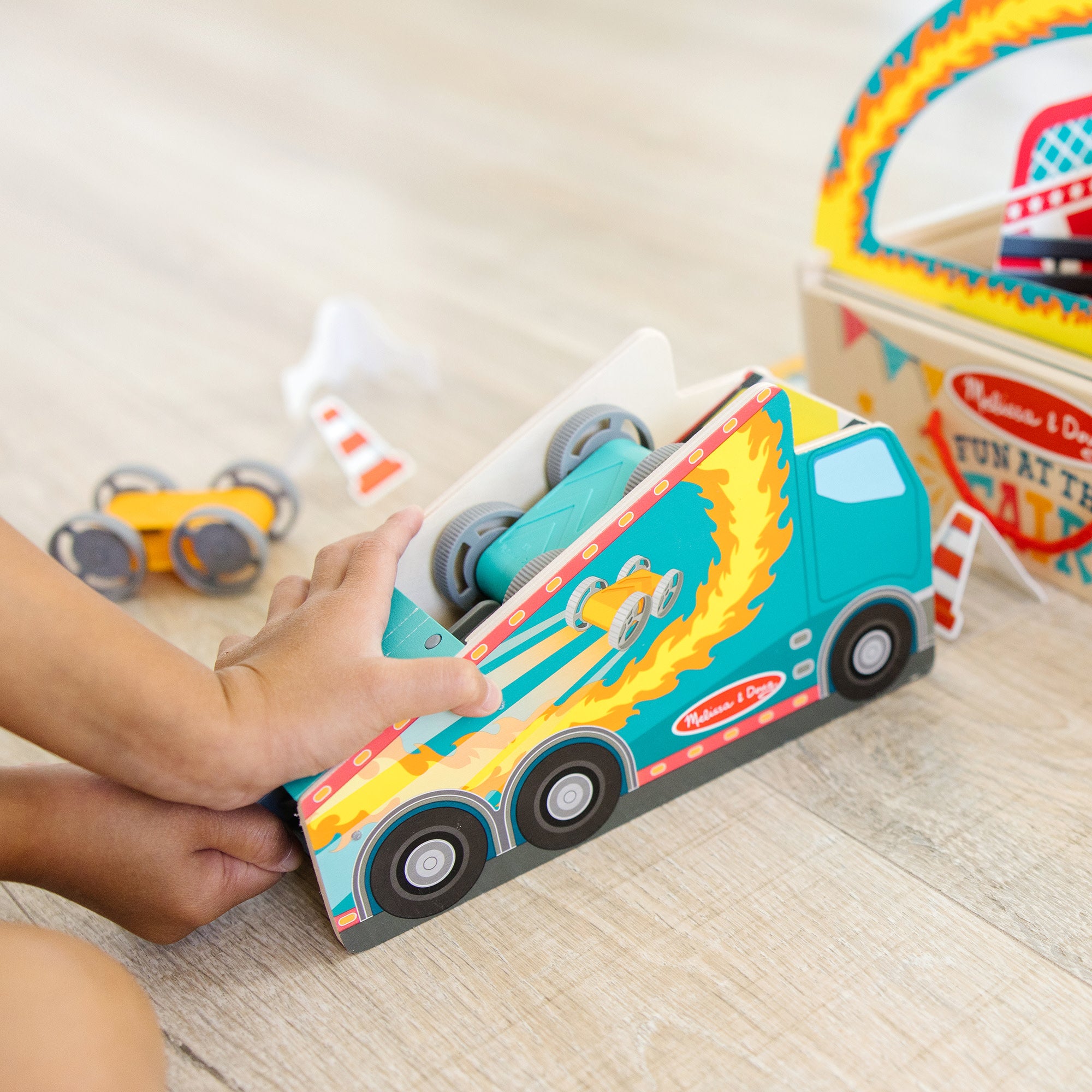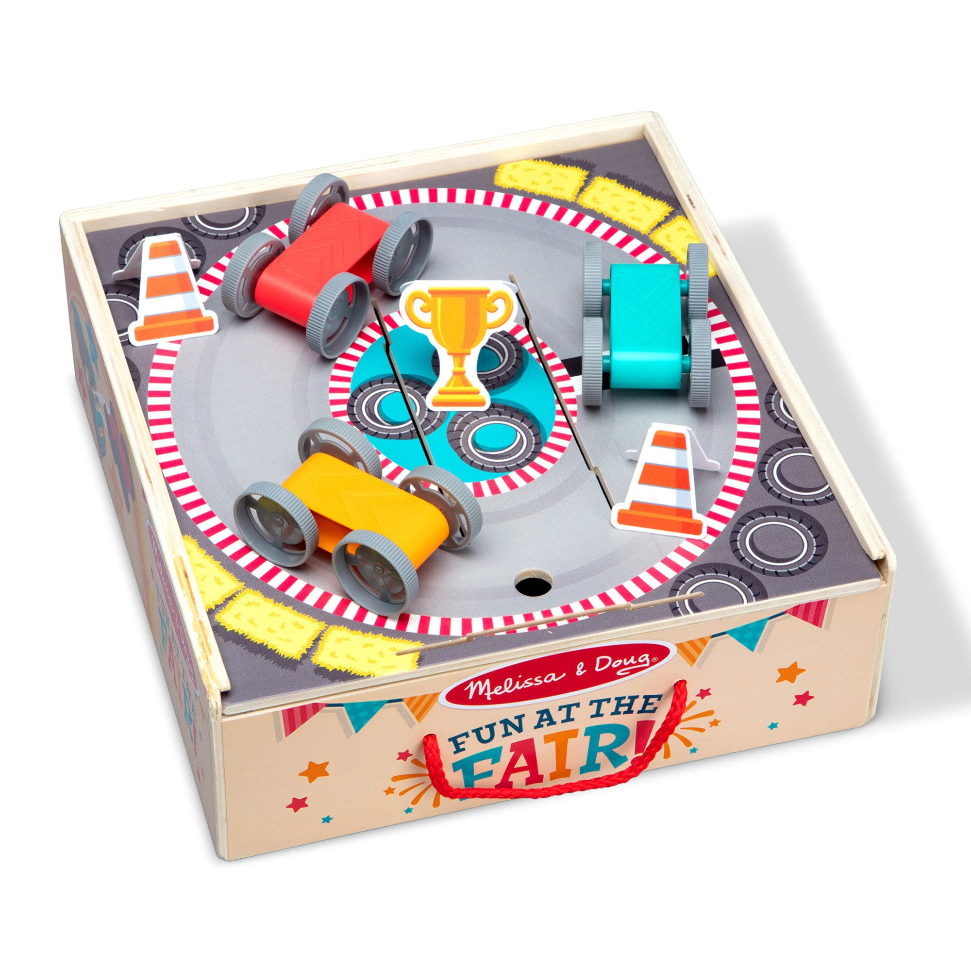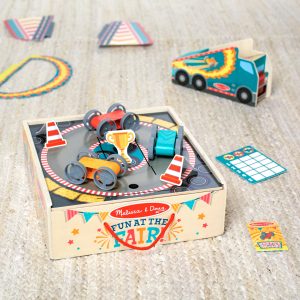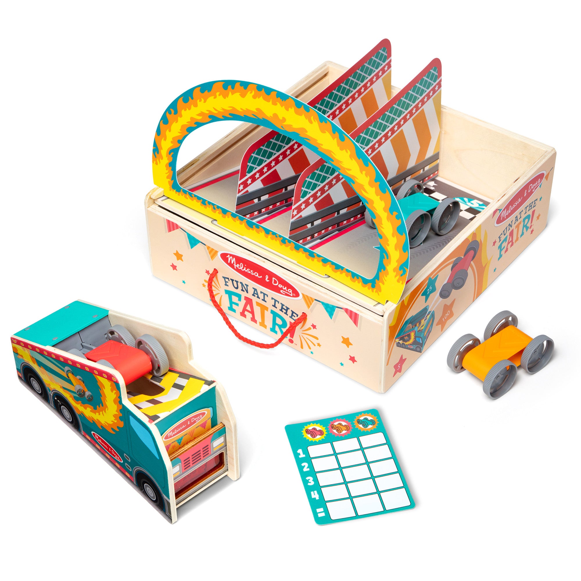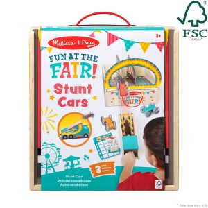 Step right up and turn any day into Fair Day! The Melissa & Doug Fun at the Fair!™ Stunt Cars lets kids three and older experience the excitement of stunt jumping race cars at home! Start playing by inserting the secret-reveal player card ticket in the front of the wooden truck-shaped launcher. Use the dividers to set up three landing zones. place a stunt car in the launcher. aim. pull and release the launch handle and send stunt cars soaring through the ring of fire! Earn points for each landing. Flip the double-sided landing pad to set up a racetrack with cone obstacles and a trophy for the winner. Fun for independent play or challenge friends. All pieces store in the landing zone box with lid. Designed to amuse. surprise. and challenge kids three and older to keep them laughing and learning through play. Stunt Cars is an engaging. hands-on way to introduce colors. counting. and cause-and-effect. and to encourage fine motor skills. From games of skill and chance to innovative carnival-inspired play sets. the Melissa & Doug Fun at the Fair!™collection brings home all the fun of a day at the fair! This product is certified by the Forest Stewardship Council. FSC certification ensures that products come from responsibly managed forests that provide environmental. social. and economic benefits. and that forests are protected for future generations. Please note that FSC certification applies to new inventory only (FSC C156584)