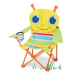 Bold stripes and Giddy Buggy’s big blue eyes provide an inviting seat when your busy child needs to take a break. This delightful folding chair with sturdy metal frame also has a handy cup holder positioned at your child’s fingertips! Durable and water resistant fabric and a convenient storage bag make it perfect for trips to the beach. the park. the campground. or anywhere your child’s imagination may lead!