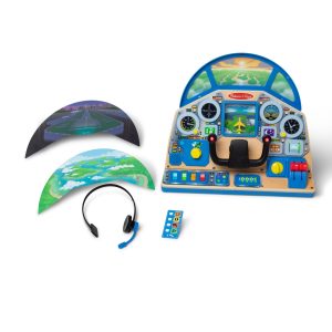 Ready to let imaginations take flight? Roger that! The Jet Pilot Interactive Dashboard features lights. buttons. switches. and sounds to keep kids engaged and immersed in exciting pretend-play adventures. An airplane steering yoke is mounted on a sturdy wooden cockpit dashboard with a snap-on windscreen that fits three double-sided. full-color destination scenes. A four-position throttle plays engine sounds and adjusts the speed of a scrolling map; turn the yoke to move a mini-plane in the scrolling display! Press and hold a button to record a message. and release to play back with voice change. Turn the destination dial to hear hello in six different languages (English. Mandarin. French. Hindi. Spanish. Arabic) and press the radio button for music from each destination (U.S.. China. France. India. South America. and Africa). Other sound effects include turbo boost. night mode (changes the color of dials. too!). seatbelt. weather options. landing gear. and turning. Light-up dials include altimeter. horizon. heading. and airspeed indicators. Add to the pilot role play experience with the pretend play headset and a reusable takeoff and landing checklist. The dashboard. which has two volume options. requires three AA batteries. not included; the toy automatically turns off after approximately nine minutes of inactivity to prevent battery drain. This product is certified by the Forest Stewardship Council. FSC certification ensures that products come from responsibly managed forests that provide environmental. social. and economic benefits. and that forests are protected for future generations. Please note that FSC certification applies to new inventory only (FSC C156584)