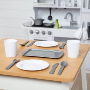 Play time will heat up with this perfect companion set to play kitchens and restaurants! The 22-piece set includes a pretend play pot with lid. frying pan. cookie sheet. spatula. serving spoon. two plates. two cups. two forks. two knives. two spoons. and a timer. all made of durable plastic for long-lasting play. There are also salt and pepper shakers. a wooden olive oil bottle. a dish towel. and an oven mitt. Budding chefs three and older will be able to serve up imaginative fun for years to come with this kid-sized food play accessory set.