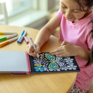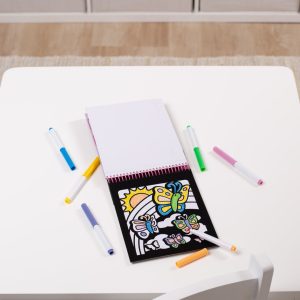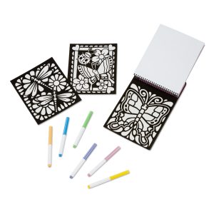 Magic Velvet coloring scenes are filled with special effects! The velvet-flocked backgrounds create amazing contrast with the six vibrant marker colors. And hidden patterns appear when you color in the scenes! This compact. spiral-bound coloring activity book is just the right size for kids and perfect for travel . . . the felt-tip markers store right in the cover. Six sturdy coloring boards feature butterfly – themed scenes.