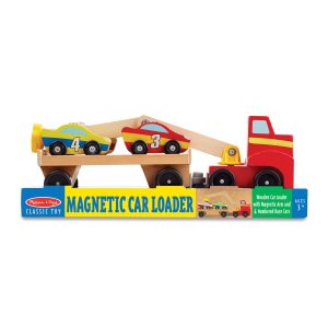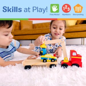 This big red rig has a magnetic arm that can reach every car on its trailer! It’s one terrific wooden vehicle set with so much to offer: Link up the trailer to the car carrier to take the four magnet-topped cars for a drive. then unload each one at its destination. Sort and sequence the wooden cars—each one has a unique color. stripe. and number to inspire playful counting. sorting. and sequencing activities. Then load the cars again and roll out! Car- and truck-loving kids will love discovering endless play possibilities as they roll this wooden truck toy all around the house and to the ends of their imaginations. The tough vehicles have sturdy wooden chassis and smooth-rolling wheels. so they’ll stand up to countless deliveries and road trips. And maneuvering the articulated arm is easy to do. great for fine motor skills and hand-eye coordination. and so much fun!