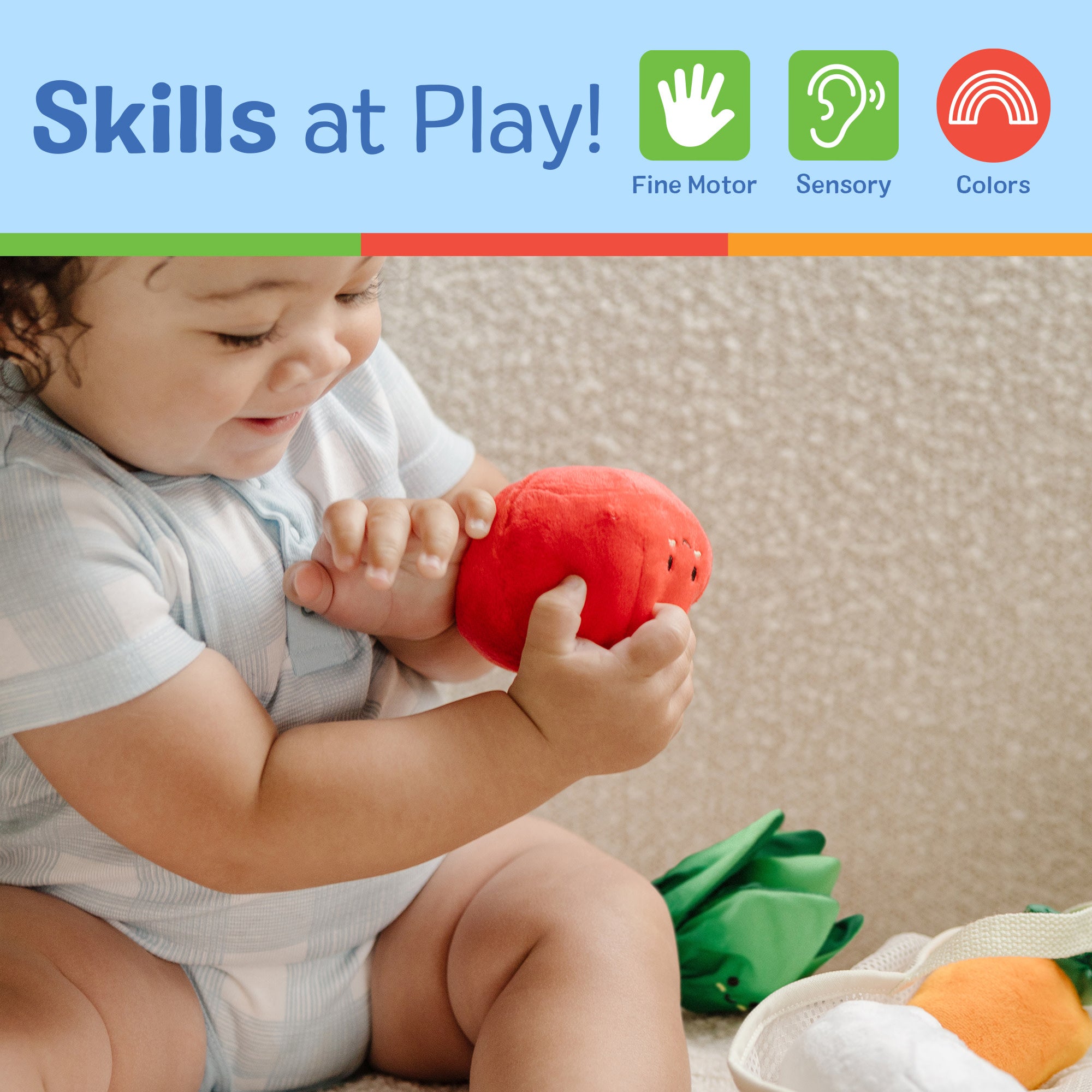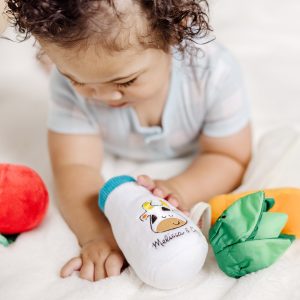 Add a fresh twist to playtime with touchable. tactile farmer’s market play food favorites delight the senses! Fill the mesh mini-grocery tote with a squeaking carrot. chiming milk bottle. rattling tomato. and crinkling lettuce. all featuring sweet. friendly faces. Pull out the easy-to-grasp pieces and refill the tote again and again! The Market Basket Fill & Spill is an engaging way to help infants six months and older develop important sensory. fine motor. and color recognition skills. Melissa & Doug infant and toddler toys inspire a-ha! moments of discovery. Adorable. diverse characters and a variety of fun shapes and textures encourage exploratory. skill-building play.