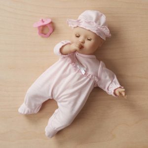 Jenna is the ideal. sweet smelling. first-born baby doll. Even the youngest caregivers will love her adorable face and soft. cuddly body (and grown-ups will love her wipe-clean arms and legs!). She has molded plastic hair and is pretty in pink from head to toe. in a removable smocked outfit and matching cap. Her blue eyes open and close. and she can suck her thumb or her pacifier (included).
