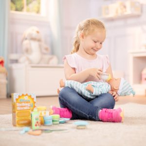 When it’s time for kids to feed their special babies meals and snacks. this 24-piece set offers the perfect selection of realistic feeding accessories sized just right for dolls and stuffed animals! From a bottle with disappearing milk. a sippy cup. applesauce squeeze pouch. and baby food jars. to meal inserts. cereal Os. rice cereal. and teething biscuits. kids will love the variety of food they can offer their babies. There is a wipe-clean bib. durable divided dish. utensils. and snack container. and a double-sided reusable activity card. With Mine to Love toys. kids three and older can explore grown-up roles and responsibilities while having endless fun caring for their babies. (Dolls/stuffed animals not included with this set.)