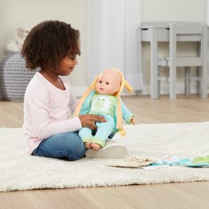 Dress up dolls for playtime with this six-piece set of coordinating unisex clothes. sized to fit 12-inch to 18-inch dolls! Mix and match the long-sleeved froggy character shirt. puppy dog T-shirt. soft pants with elastic waistband. hooded zip-front sweatshirt. easy-on cargo shorts. and adjustable-band cap! Sturdy construction and quality fabric mean dolls will be dressed to play for years to come. All pieces are machine washable and hang on two durable hangers. With Mine to Love accessories. kids three and older can explore grown-up roles and responsibilities while having endless fun caring for their babies. (Dolls/stuffed animals not included with this set.)