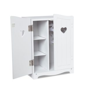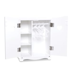 Help favorite dolls and stuffed animals get organized with this realistic and modernly styled wooden armoire that suits any décor! There are three shelves for folded doll clothes and a rod with three hangers for dresses and jackets (clothing not included). The sturdy white closet with two hinged doors stands approximately 17 inches tall and features a wipe-clean surface. Clear instructions make it easy to assemble with just a screwdriver (not included). Mine to Love dolls and accessories encourage empathy and help kids express themselves as they explore grown-up roles and responsibilities. A child’s confidence and self-esteem blossom and grow with each nurturing moment of imaginative play!