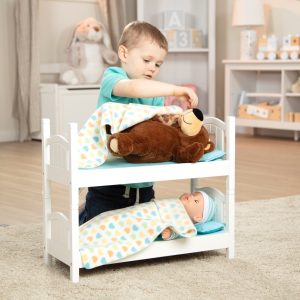 Tuck in favorite dolls and stuffed animals for bedtime or sleepovers with this realistic and classically styled wooden bunk bed that suits any décor! Made to fit dolls up to 18 inches tall. these two durable white beds with a wipe-clean surface can be used side by side or stacked to stand approximately 17 inches tall. The set includes two mattresses. two blankets. two pillows. and a movable wooden ladder. Clear instructions make the beds easy to assemble with just a screwdriver (not included). Mine to Love® dolls and accessories encourage empathy and help kids express themselves as they explore grown-up roles and responsibilities. A child’s confidence and self-esteem blossom and grow with each nurturing moment of imaginative play!