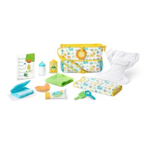 This 17-piece play set gives kids everything they need to pack up and take their favorite baby dolls and stuffed animals on the go! Realistic travel essentials. sized just right for dolls and stuffed animals. include diaper. changing mat. wipes. washcloth. comb. baby bottle and squeeze pouch. and a sunscreen tube. Everything (including a set of keys and a double-sided reusable activity card) fits in the roomy multi-pocket diaper bag with adjustable strap and write-on ID tag. With Mine to Love toys. kids three and older can explore grown-up roles and responsibilities while having endless fun caring for their babies. (Dolls/stuffed animals not included with this set.)