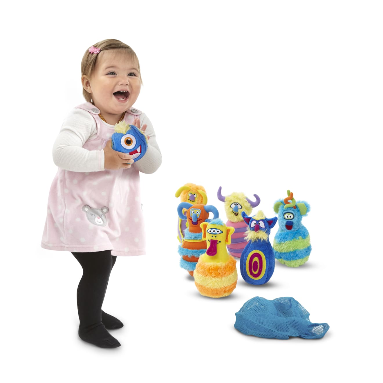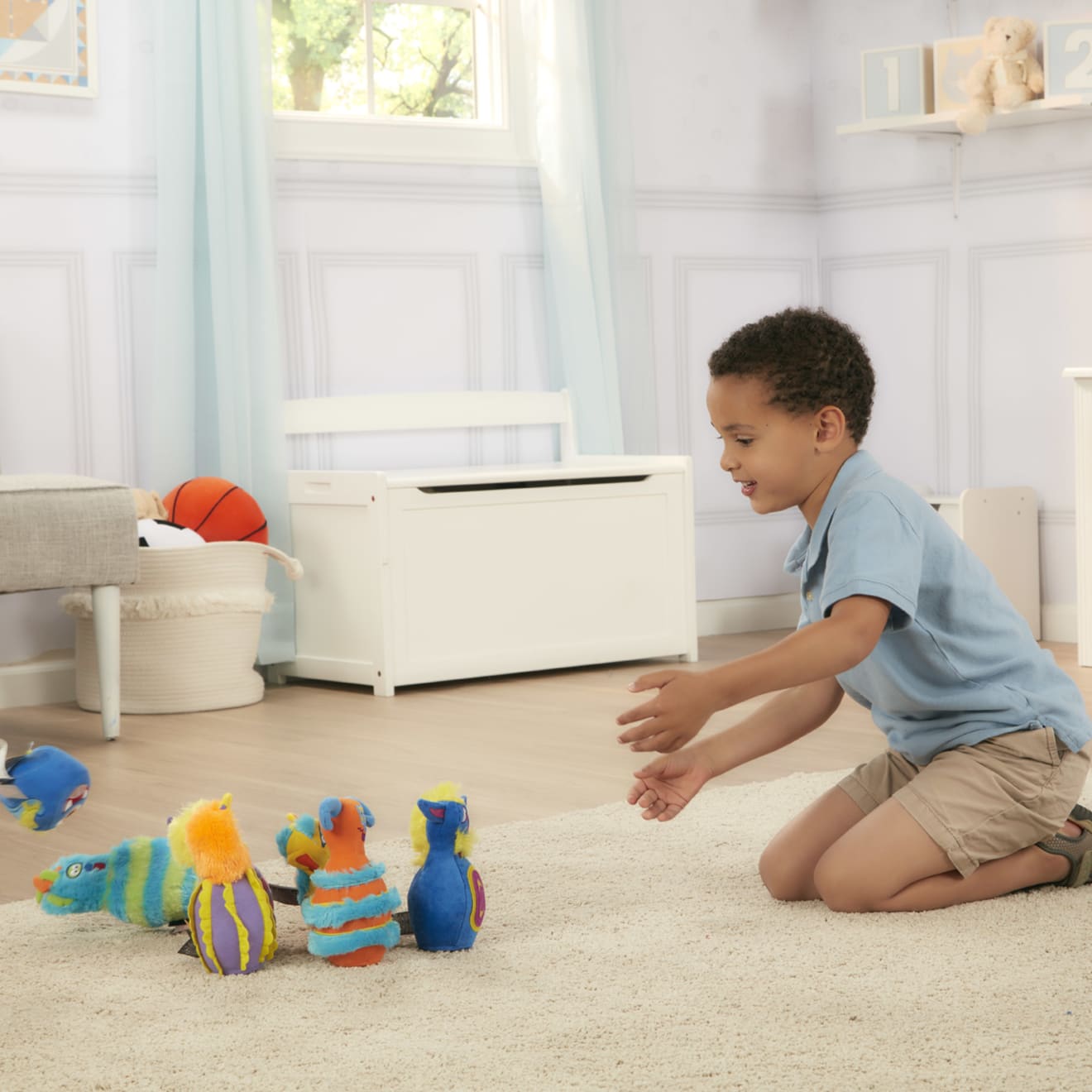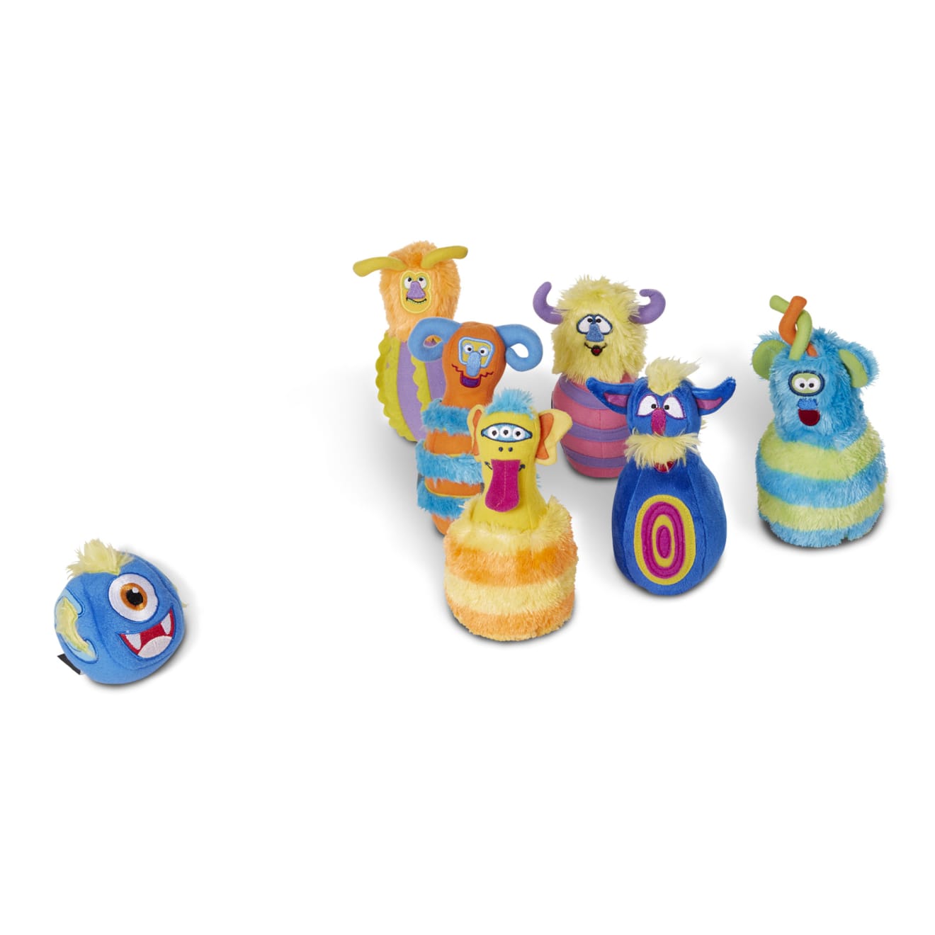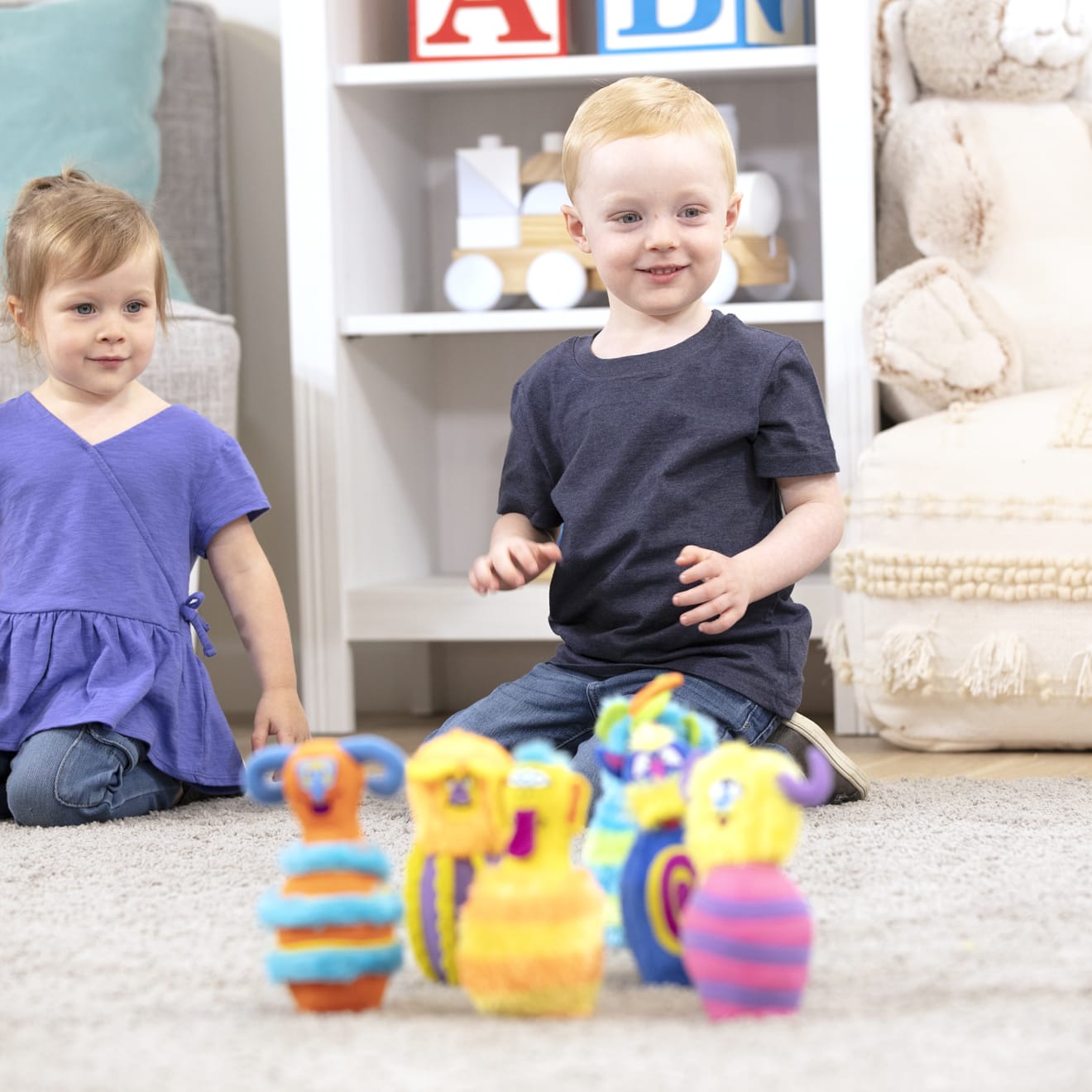It’s scary how much fun you’ll have with these fuzzy monster pals! The beastly bowling set adds color. texture. and a whole lot of eyes to a familiar game. Six wacky plush pins with goofy expressions have weighted bottoms for extra stability. touchable textures. and detailed stitching. Set up the pins in different formations. then use Klonk. the silly stuffed ball. to knock them down! The set stores in a handy mesh bag to take the bowling fun wherever kids go.