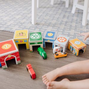 Take six nesting and sorting blocks. add six numbered vehicles to roll inside. and what do you have? A community full of stacking. counting. hide-and-seek. mix-and-match. imaginative play! This action-packed play set lets kids build towers or a town scene filled with buildings like a hospital. fire station. or school. with a wooden vehicle for every building. On their front panels. the blocks feature doors so the vehicles have a place to park. Kids can also pair numbers on the buildings and vehicles or match by color to put together the correct pairs. reinforcing early-learning concepts as they play. This product is certified by the Forest Stewardship Council. FSC certification ensures that products come from responsibly managed forests that provide environmental. social. and economic benefits. and that forests are protected for future generations. Please note that FSC certification applies to new inventory only (FSC C156584).