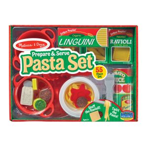 Prepare perfect pretend pasta every time with this 50-plus-piece pasta-making set! Fun pasta boxes hold felt penne. bow tie pasta. linguini. and ravioli pockets that can be hand-stuffed with felt spinach. meat. or cheese fillings. Follow the illustrated guide to order and cook the pasta in the large cook pot with lid. and strain it in the colander over the cooktop and sink play mat. Use the pasta spoon to scoop into the included pasta bowl. top with tomato sauce. cheese. or. butter toppings. and dig in! The set also includes a sauce jar. cheese shaker. salt shaker. and fork. This inventive set lets kids create countless imaginative pasta meals from start to finish!