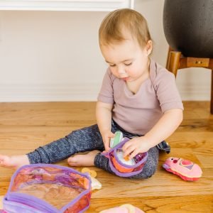 Everything necessary for the little girl on the go fits into this pretty purse! This soft play set includes a cell phone that chimes. a key ring with keys. a change purse with coins and a compact with a child-safe mirror. Everything is easily removed and replaced into a charming pink purse with a purple handle. Constructed of high-quality fabrics and plastic. this durable set will provide hours of pretend fun!