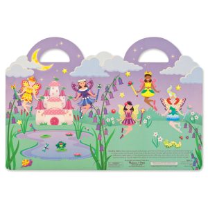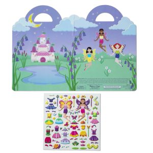 Let imagination take flight with two sensational sticker scenes! This reusable puffy sticker set includes a sturdy double-sided background panel. plus 75 glitter-filled puffy stickers. Use the stickers to fill a sundrenched meadow or twilight fairy-castle garden. adding butterflies and other fairy friends. Or dress five fairies in an array of mix-and-match tops. skirts. wands. shoes. and crowns to add some stylish fun! Easy to place. layer. and reposition. the reusable stickers make it easy to tell a story of fairy enchantment. Simply place the puffy stickers on the board. then change the picture whenever you’re ready to change the story! The built-in sticker collection–75 fairy stickers in all–offers endless opportunities for kids to express their creativity. all while improving fine motor skills and communication. A diecut handle and fold-and-go format make this kids’ sticker activity set great for travel. too!