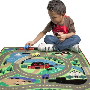 This colorful road rug comes with four cars to drive on looping streets and lanes — and its varied terrain makes it ideal for trains. chunky play figures. and vehicles of all kinds! Durably made to look great for countless playtimes to come. the woven rug features a handsome farm surrounded by a circular road system. which connects a school. parking lot. grocery store. lakeshore. and more — all in a convenient arrangement that makes it easy for kids to play.