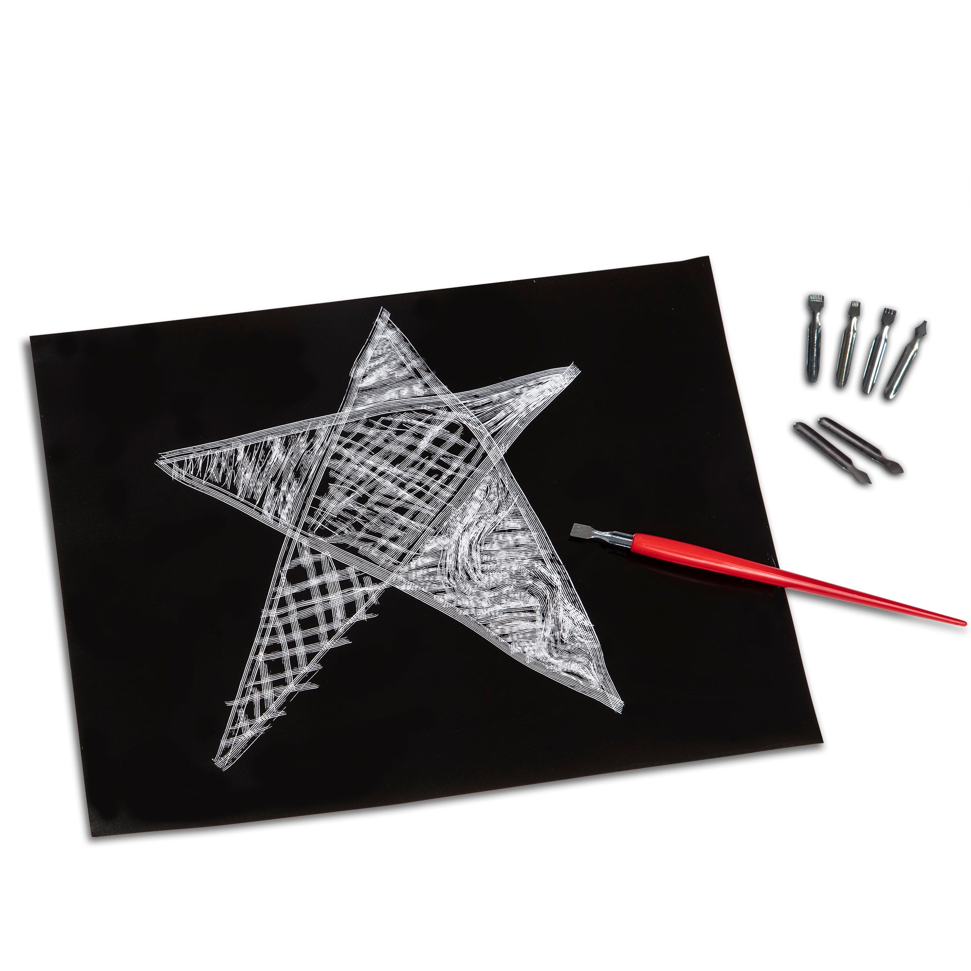 Make precision etchings every time with this versatile Scratch Art tool kit. Simply slot the tip piece of your choice into the Scratch Art penholder – each one creates a different effect! Metal tips are heat-reated to retain sharpness and plated to resist rust; penholder is made of durable. flexible plastic for excellent grip and maneuverability.