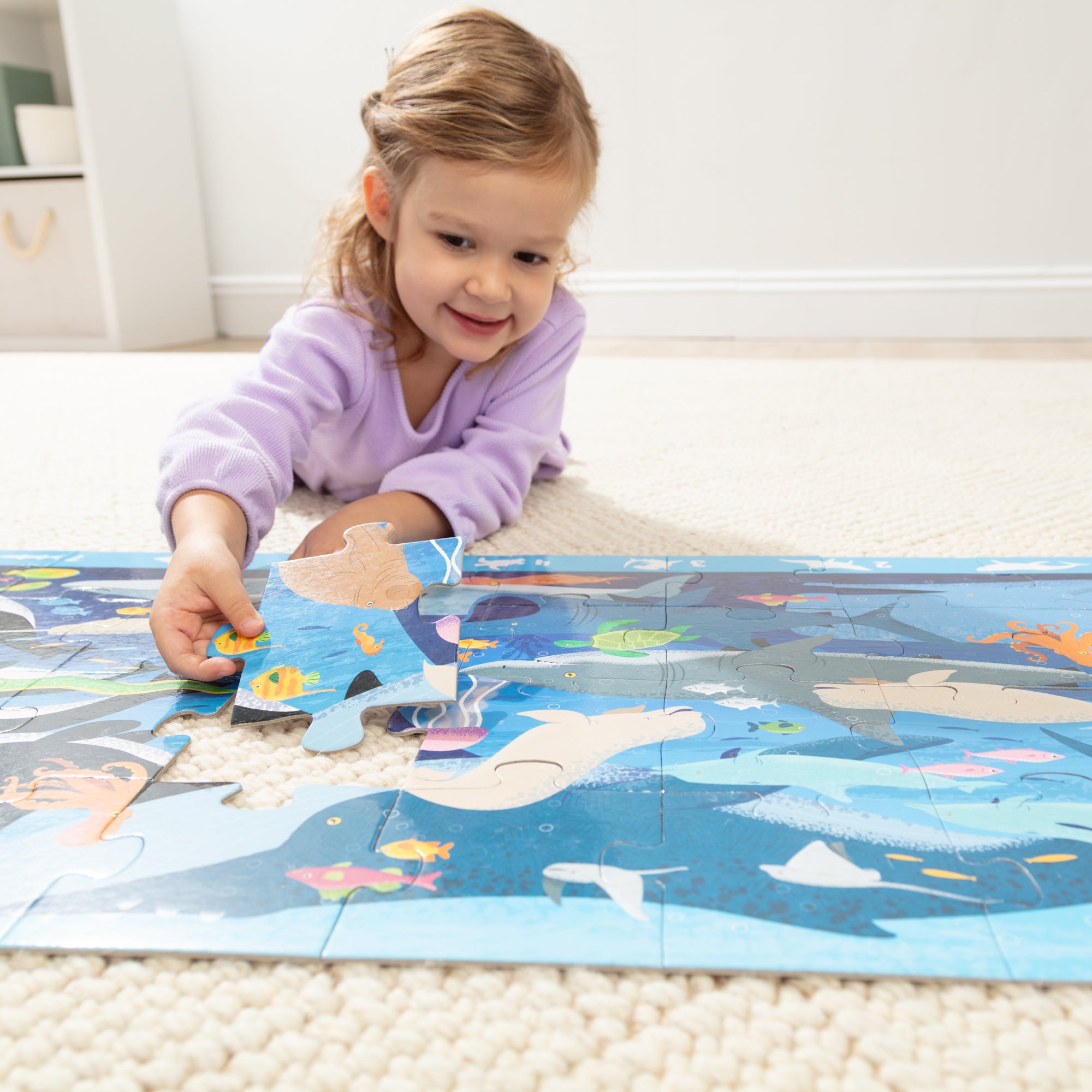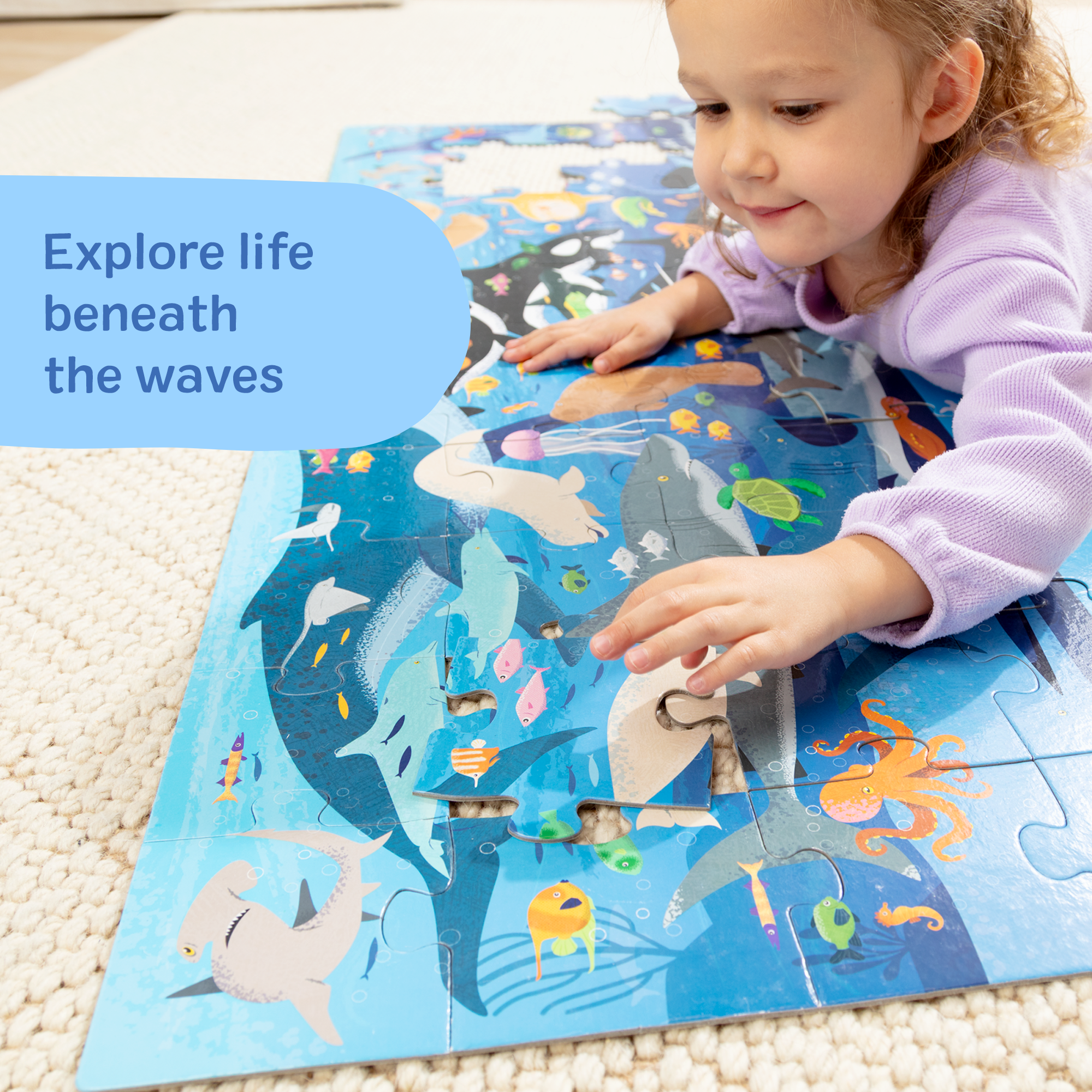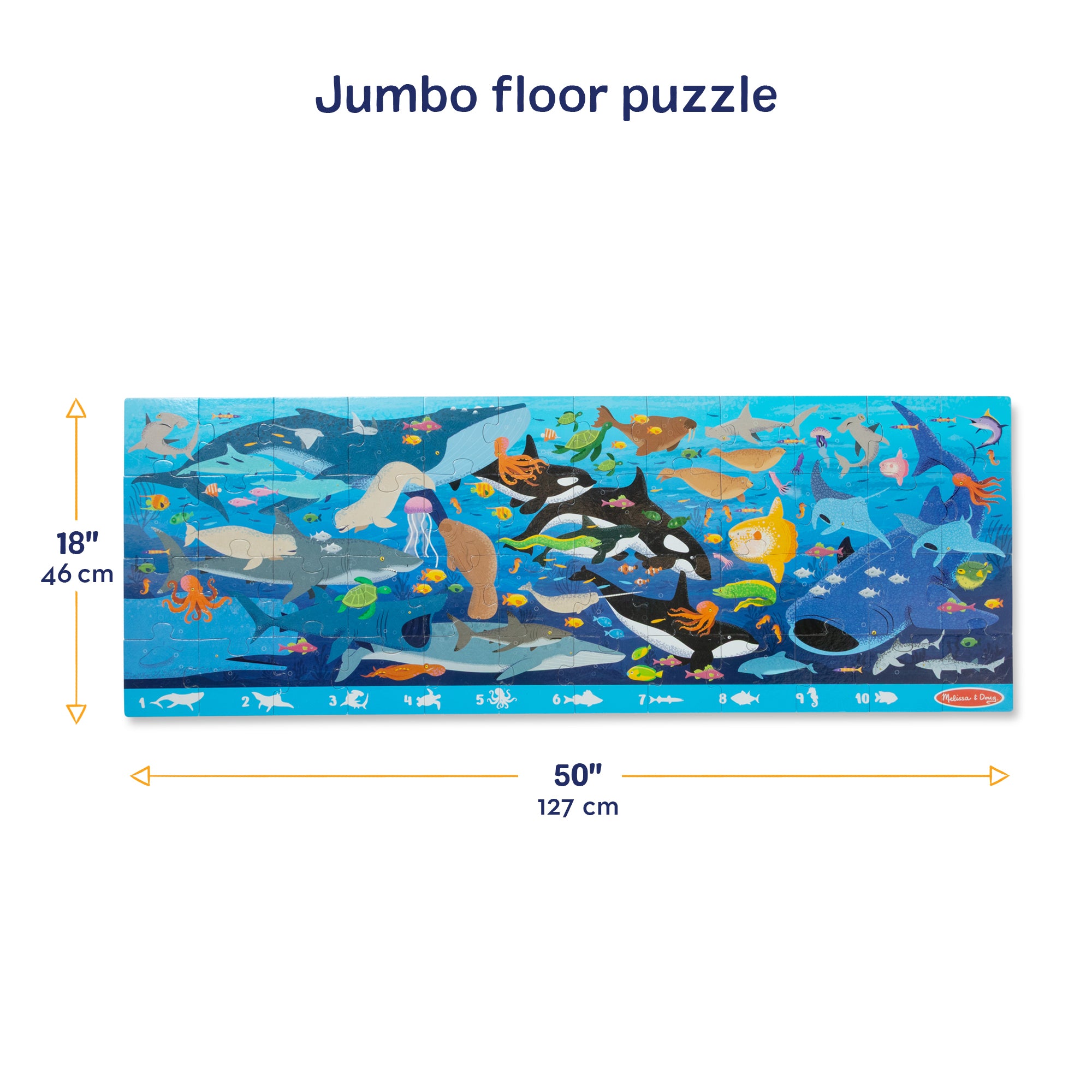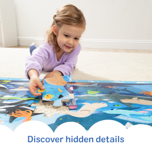 Dive into an underwater adventure with the Melissa & Doug Beneath the Waves Search and Find Floor Puzzle! This jumbo 48-piece puzzle measures over 4 feet long when assembled and features a vibrant ocean scene filled with colorful marine life and hidden objects to spot and count. A visual guide is printed right on the puzzle to make search-and-find play easy and fun—no reading required! This interactive puzzle is a wonderful addition to any collection of preschool toys for kids and is just right for birthday gifts. holiday gifts. or special occasions. Melissa and Doug kids puzzles are Montessori inspired preschool learning activities that strengthen spatial awareness and fine motor skills as they bring their imagination to life! For even more meaningful developmental play. combine this with other Melissa and Doug pretend play toys for kids that love preschool learning activities like jigsaw puzzles. & games like the Secret Decoder Deluxe Activity Set & the Hungry Pelican. for endless learning adventures. For 35+ years. Melissa and Doug has crafted imaginative preschool toys and durable wooden toys built to nurture childhood wonder. with everything from a life-sized grocery store playset to a play kitchen playset and play food to serve plush toys & puppets. to costumes. arts & crafts. and road trip activities for kids. It’s the kind of kid-powered play that builds independence and confidence!