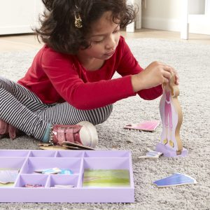 With 40+ magnetic pieces. kids can mix and match to create one-of-a-kind fashions! These wooden dress-up princesses come with their signature fashions to wear and share . . . plus all the pieces children need to make styles from their own imagination. They’ll love making their own fashion stories starring Sleeping Beauty and Snow White!