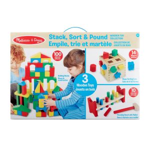 Exercise fingers and brains with these beautifully crafted. made to last classic wooden toys designed to entertain and engage! The Melissa & Doug Stack. Sort & Pound Wooden Toy Collection includes three childhood favorites: 100 brightly colored building blocks. a 14-piece shape sorting cube. and a 10-piece pounding bench with mallet. Kids two and older will delight in stacking. building. sorting. and hammering. while gaining invaluable practice with fine motor skills and dexterity. color and shape recognition. and pre-math skills.
