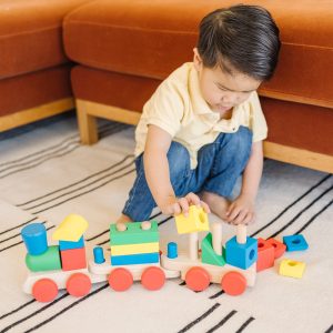 Send your child’s imagination on a colorful journey with this classic wooden stacking train. Designed to help little ones practice fine motor and cognitive skills. this classic favorite will have kids on a roll! Sturdy. pegged cars are the base for 15 colorful pieces that can be configured over and over again. When assembled. the train is over 17 inches long–children can also separate the cars to change things up or share the fun. It’s no wonder little ones and their parents choo-choo-choose this toy year after year!
