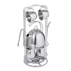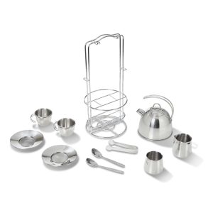 Turn playtime into a special occasion with this shiny polished steel tea service play set! A stainless steel teapot with lid and two cups feature sturdy looped handles with riveted joints that won’t weaken or wear. Pretend to serve tea for two using the two saucers and teaspoons. a creamer. sugar bowl. and tongs for imaginary sugar cubes. All of the pieces are polished to a mirror-finish for an extra-fancy flair. and store on a handy metal storage rack. Kids three and older will love having imaginary tea parties with this special set!