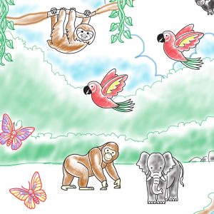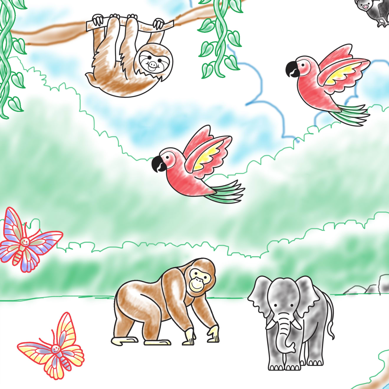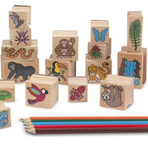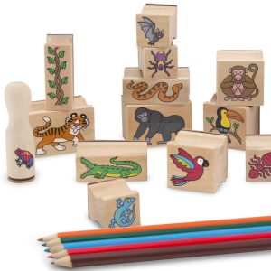 Monkeys. snakes. birds and bugs galore combine to create a jungle straight out of your imagination! This extra-large stamp set for kids makes it easy to create an exciting storyline or a color-in scene: It includes 20 rubber-faced. wooden-handled outline stamps and a two-color stamp pad filled with blue and green washable ink. Five colored pencils coordinate with the jungle theme to add details and color in the scene. It’s a complete arts & crafts activity and storytelling kit in one!