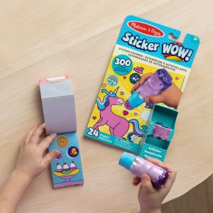 Melissa & Doug Sticker WOW!™ is a whole new way to play with stickers! Let the adorable. collectible Sprinkles the Purple Unicorn stamp. stamp. stamp its way through 24 pages of fun-filled. fantasy-themed counting. matching. and search-and-find activities. The refillable sticker stamper comes pre-loaded with a sticker stack of 300 assorted stickers – with 100 unique designs in every stack. each sticker is a surprise! Plus. this set is bundled with a refill pack of 200 EXTRA favorite things-themed stickers (compatible with any Sticker WOW!™ sticker stamper) and an additional mini favorite things-themed activity pad for even more Sticker WOW!™ fun. Stickers are not reusable. but are easy to remove if necessary. Fill in the activity pages and use for creative art projects. such as bookmarks. posters. cards. and more. Easy-to-remove stickers and the convenient on-the-go format with built-in sticker stamper storage makes Sticker WOW!™ a great mess-free travel activity. Sticker WOW!™ (patent pending) promotes fine motor skills. encourages creative play. and it’s satisfying. fidget fun!
