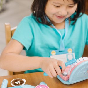 Smile. the dentist will see you now! This 25-piece dental care play set features an over-sized set of pretend teeth so young dentists-in-training can give cleanings. treat cavities. and even fit retainers and braces! Mark the pretend teeth with the cavity stickers. then use the vibrating tool with interchangeable polishing and drill heads. and the toothbrush to clean. The set includes realistic instruments like a pick. mirror. and floss. a dental rinse bottle and cup. 2 gauze pads. 2 tooth polish cups. and an instrument tray to keep organized. A mask. reusable ID tag on a lanyard. and a double-sided reusable activity card round out the dentist’s office experience. The play set is a fun and engaging way to teach good dental health practices. and to ease kids’ fears or feelings of stress associated with a visit to the dentist. Spark a child’s creativity and imagination. and to inspire young dentists for years to come.