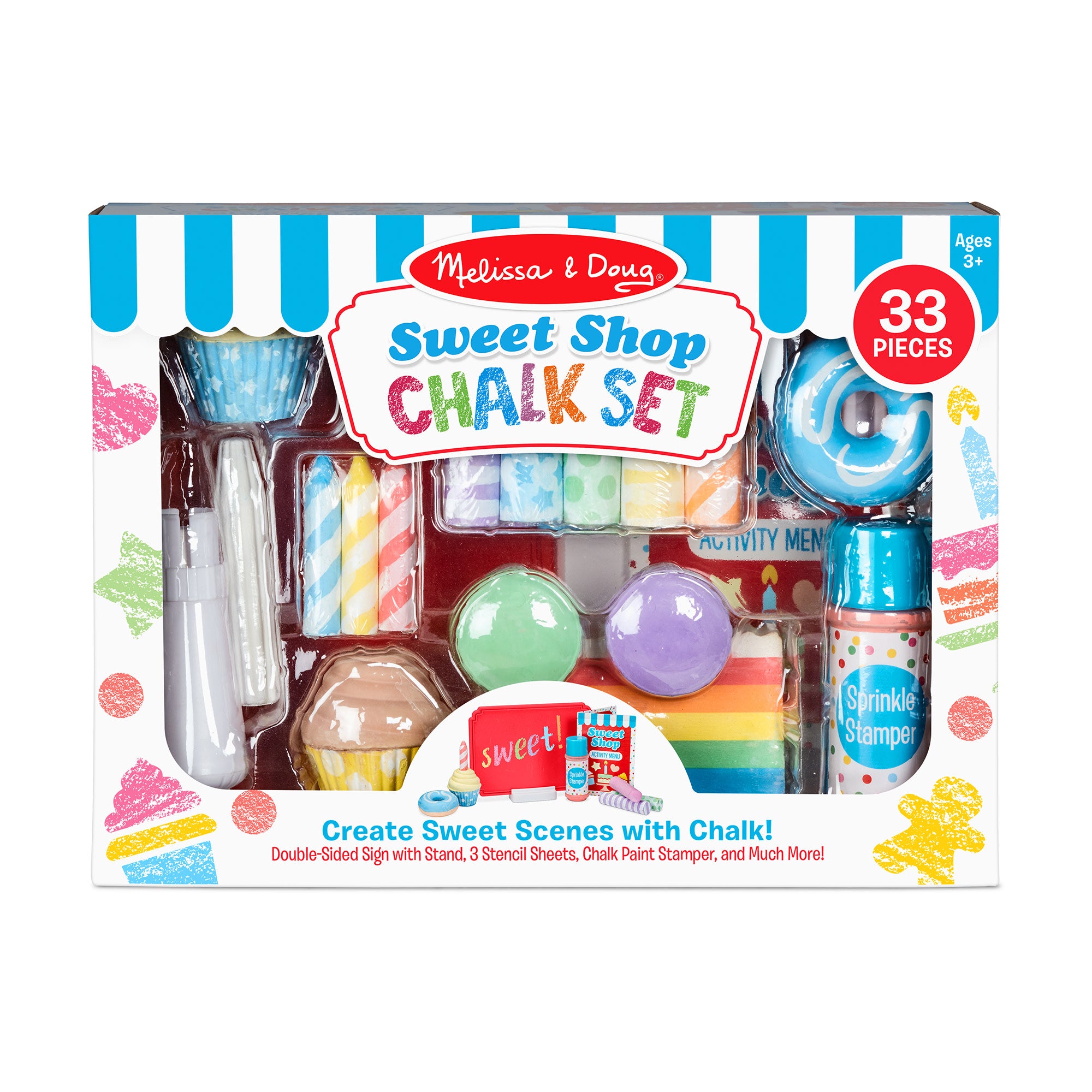 Create countless scenes with colorful chalk in sweet dessert shapes! Draw. trace. and stamp chalk designs with chalk cupcakes. cookies. birthday candles. frosting. donut. jumbo sticks. and more! The vibrant colors in this deliciously adorable 33-piece play set are perfect for drawing on the included sign with holder. sidewalks. driveways. or chalkboards. Trace shapes on three extra-thick stencil sheets or make quick and easy rainbow lines with the multi-colored slice of cake! Add water to the sprinkle stamper to make chalk paint polka-dots. There’s a menu of drawing and game ideas to help jumpstart imaginations—the possibilities are endless! Kids three and older will love creating sweet chalk designs again and again!