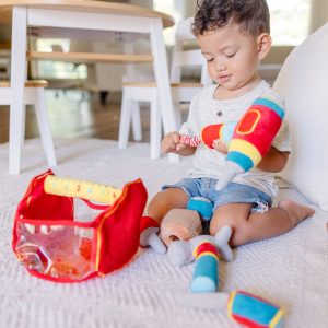 Even the littlest builder needs the proper tools! Here is a handy plush toolbox with a ruler handle. This nine-piece set includes a hammer. screwdriver. saw. nails. screws. blocks and a drill that vibrates. Constructed of high quality fabrics and pthalate-free plastic. this durable set will provide hours of spilling. filling and building fun.