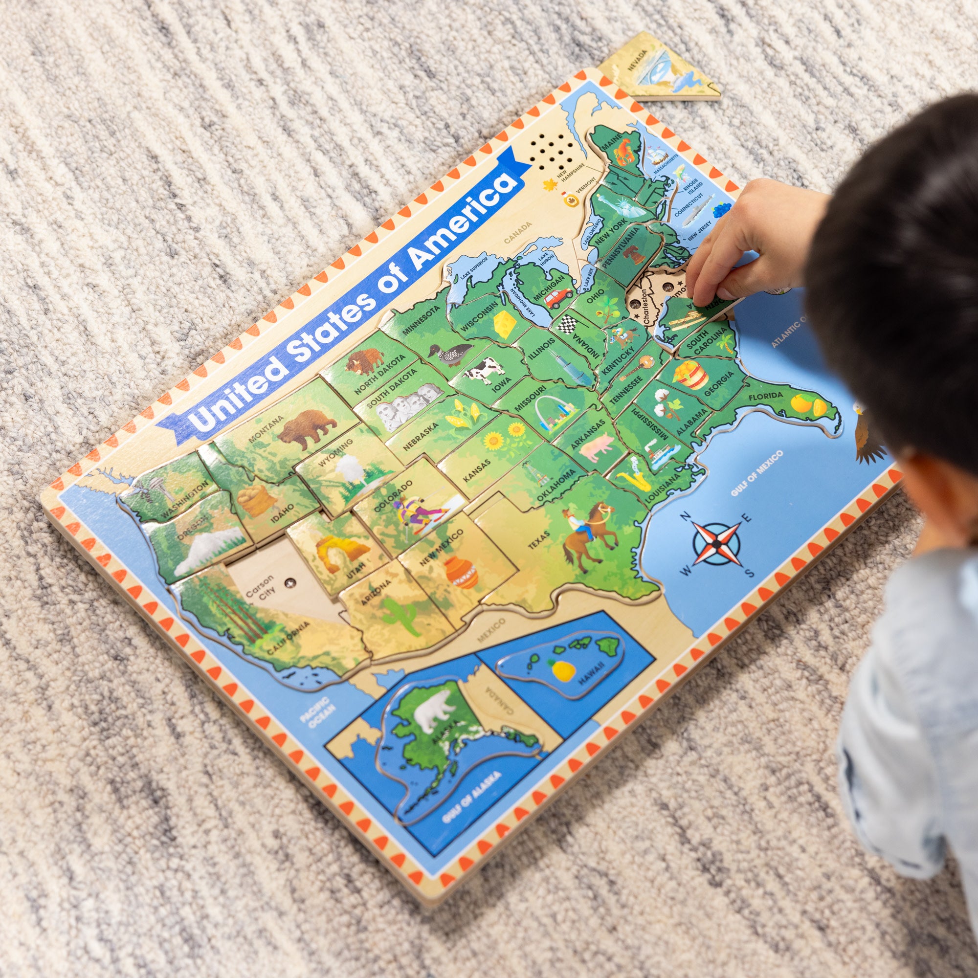 Amplify your child’s learning and play experience with this fabulous U.S.A. Map Sound Puzzle. As each piece is placed correctly in the puzzle board. your child will be delighted to hear the name of that state’s capital. Colorful illustrations on the map pieces depict images associated with that state. and under each piece you can see an outline of the state’s border. It includes 40 puzzle pieces made of top-quality wood to ensure durability and longevity. This Melissa & Doug sound puzzle provides kids with a great introduction to the states while they practice motor skills. hand-eye coordination. and problem-solving skills. It makes an exceptional gift for boys and girls ages five and older for hands-on. screen-free play. (TIP: Puzzle has light activated sensors; for best results. expose the sensor by removing a piece in a brightly lit room. then make the sound play by replacing the piece in the board.)