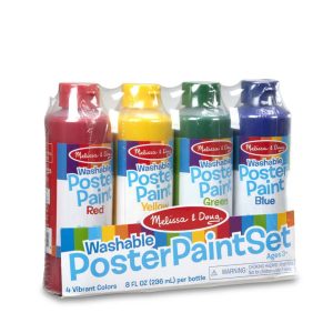 Perfect for art projects. this set of four washable poster paints comes vibrant red. yellow. green. and blue (8 oz. / 236 mL of each) in squeezable bottles with flip caps. These paints offer excellent coverage. When it comes time to clean up. soap and water does the trick on skin and normal laundering releases paint from most fabrics!