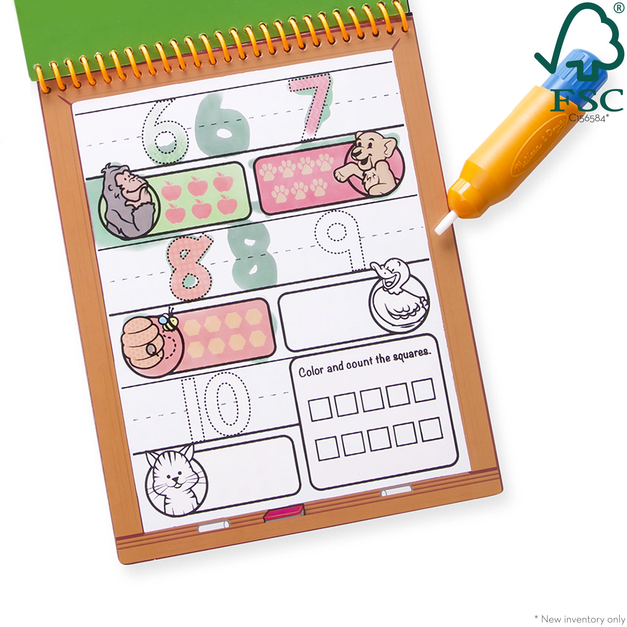 This exciting activity book includes four reusable pages and a refillable water pen. Use the pen to fill in each activity. from coloring in counters to tracing numbers. and see hidden colors and pictures appear with every stroke! Then simply let the page dry to erase the pictures and fill it in again and again. This learn-to-count book includes numbers 1-20 to trace. alongside pictures of familiar objects to count. There are empty lines to practice writing the numerals. too! The chunky-sized water pen is easy for kids to hold and stores neatly right in the front cover. This product is certified by the Forest Stewardship Council. FSC certification ensures that products come from responsibly managed forests that provide environmental. social. and economic benefits. and that forests are protected for future generations. Please note that FSC certification applies to new inventory only (FSC C156584).