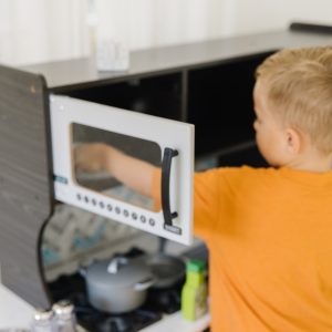 Budding young chefs can hone their craft in this beautifully designed. charcoal-colored modern play kitchen! The easy to assemble chef’s kitchen includes a refrigerator/freezer with innovative working ice maker that dispenses two included ice cubes. an oven and stovetop with dials that turn. microwave with turning plate. sink with moving faucet and handle. grocery check list. movable hooks. and ample shelving and storage for easy cleanup. Detailed. illustrated instructions make this kitchen simple to put together. Assembled. it stands approximately 3.5 feet (1 meter) long and more than three feet (0.9 meters) high. roomy enough for multiple kids to play at once. Sturdy. top-quality wooden construction means it will stand up to years of creative make-believe meal-making! This product is certified by the Forest Stewardship Council. FSC certification ensures that products come from responsibly managed forests that provide environmental. social. and economic benefits. and that forests are protected for future generations. Please note that FSC certification applies to new inventory only (FSC C156584)