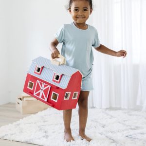 Young MacDonalds will enjoy down on the farm fun with this fully assembled. wooden barn play set. The two-story bright red barn is stocked with seven realistic plastic farm animals that kids can recognize including a horse. a goat. a pig. and more. The toy farm set also includes and wooden ladder that goes up to the second floor hayloft. and a folding corral to keep those wanderers nearby. The chunky wooden handles make it easy for kids to take their bit of country wherever they go! The bright red barn opens wide for easy play access and closes up for convenient storage and on-the-go play. The barn features doors that open and close. and plenty of open windows so little ones can check in on their farm animals inside their stalls. The Melissa & Doug Fold & Go Wooden Barn is made from durable. high-quality wood. designed for longevity and reliability. It makes a great gift for kids ages three and older for hands-on. screen-free play.