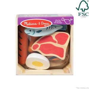 Enjoy well-balanced play with wooden play food from the protein food group. including a chicken leg. hot dog. egg. steak. fish. and a burger. The realistic play food is crafted to last for countless hours of imaginative play and stores in a sturdy wooden tray for easy sorting. Kids two-years-old and older will find the set fun to play with on its own and perfect for play kitchens. restaurants. and grocery stores. Combine with other Melissa & Doug food group sets to satisfy hungry imaginations! This product is certified by the Forest Stewardship Council. FSC certification ensures that products come from responsibly managed forests that provide environmental. social. and economic benefits. and that forests are protected for future generations. Please note that FSC certification applies to new inventory only (FSC C156584)