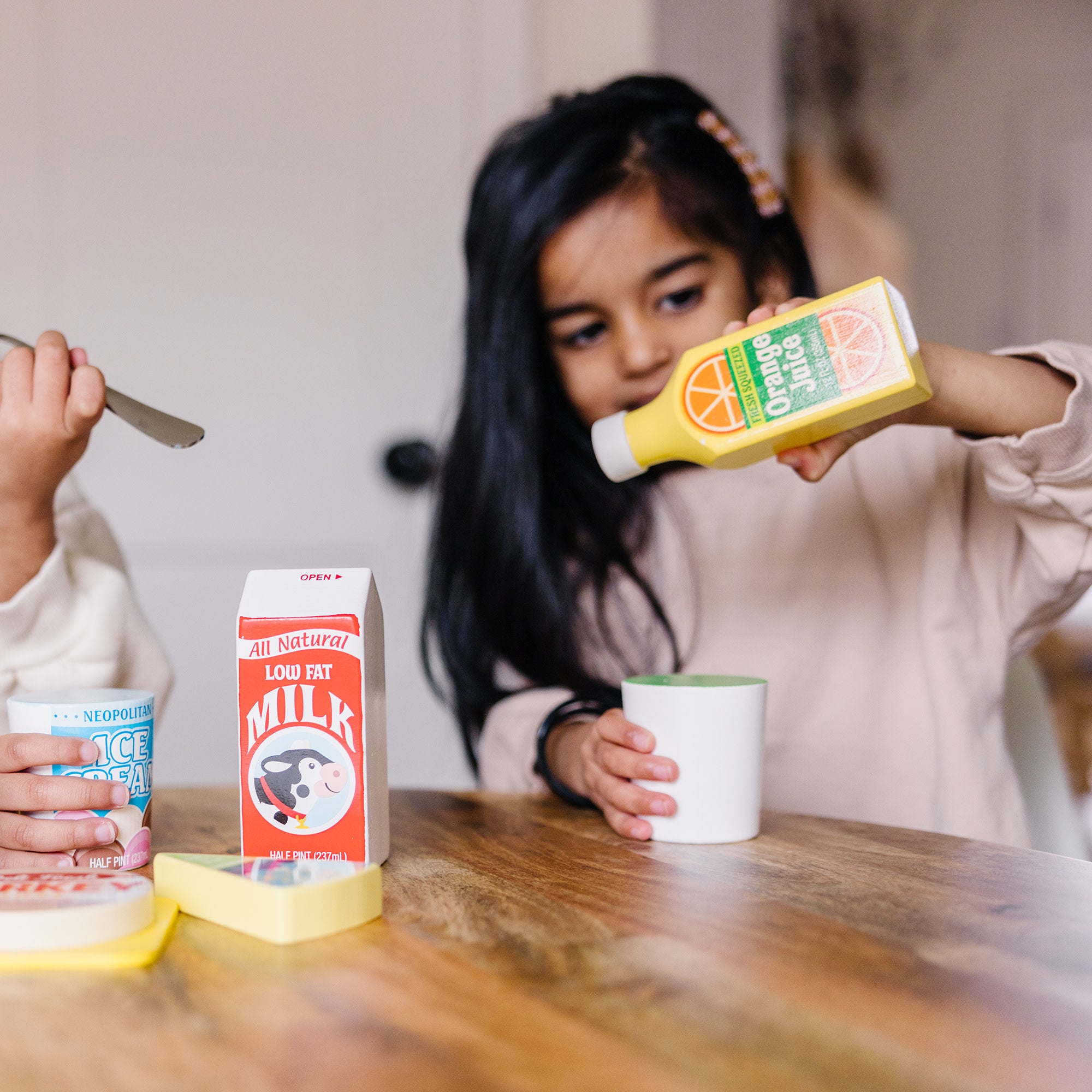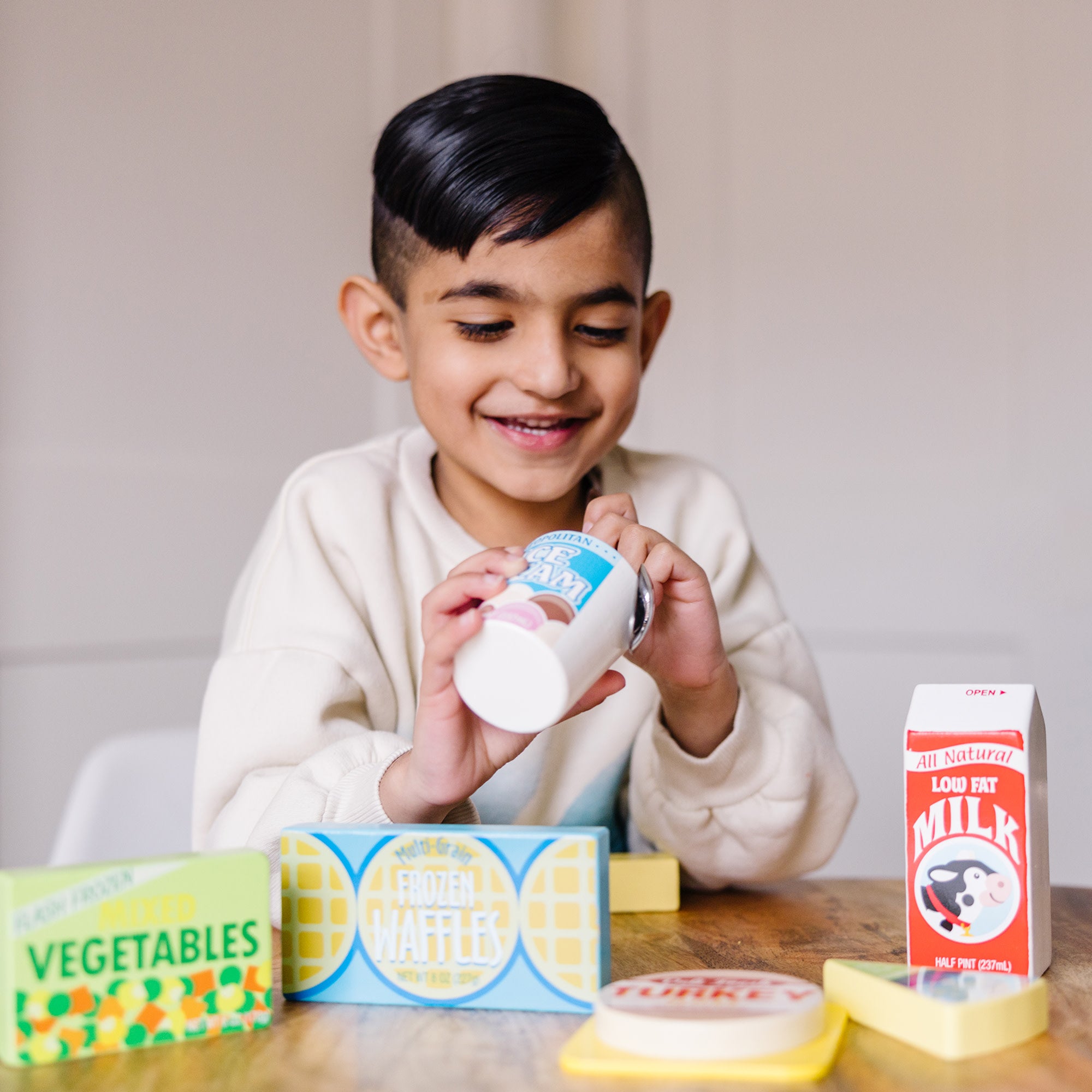 Unpack these chilled wooden groceries into your play refrigerator and freezer for delicious food play. Perfect for pretend kitchen play. or as novel manipulatives for counting. sorting and more. Nine wooden toy pieces include lots of dairy products and other fridge favorites. including orange juice. waffles. milk. ice cream. cheese. yogurt. bologna. frozen vegetables and butter.