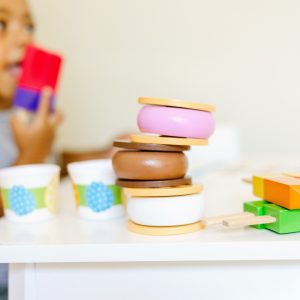 Chill out with this 24-piece mix-and-match set! Make wooden ice cream sandwiches. ice pops. and Italian ice cups. Self-stick tabs hold together three different cookie flavors and vanilla. chocolate. and strawberry ice cream fillings. There are six multi-colored ice pops on sticks to stick together and pull apart. Or. fill the lidded cups with four flavors of ice and serve with a classic wooden spoon! Display the array of chilled goodies in the storage tray and use the menu card to identify all the pieces and to place orders. This play set is a great way for kids three and older to develop fine motor. matching and sorting. and counting skills. Food play has never been so cool!