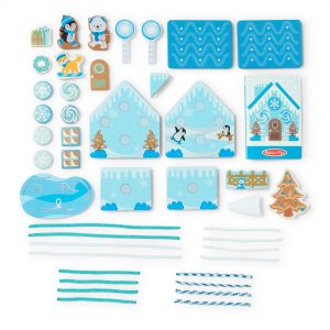 Fit together. decorate. and play with the re-buildable Melissa & Doug winter wonderland wooden gingerbread house! Decorate with reusable wooden accessories and icing cords that cling to hook-and-loop tabs for a mess-free. festive. pretend play celebration anytime! The cool blue sturdy wooden house stands about six inches tall when assembled (no tools required – hook-and-loop tabs keep pieces together); panels are double-sided. with cozy interior artwork on one side and a snowy exterior on the other. Self-sticking decorations include wooden play candies. lollipops. windows. door. and chimney. More than just a decorating activity. play pieces. including a fox. bear. penguin. tree. and a reversible pond/snow field. offer countless hours of playtime possibilities. Pieces store neatly in a decorated package for easy cleanup. The Melissa & Doug Gingerbread House Play Set is a great activity for holidays or rainy days. and helps encourage creativity. problem-solving. fine motor skills. sorting. matching. counting. and color recognition.