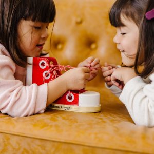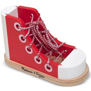 Over and under. then looping it through…look what I can do! Few things will give your child more satisfaction than mastering shoe lacing and basic tying skills. This brightly colored wooden high-top sneaker will make practicing these skills enjoyable while it helps your child reach this developmental milestone. The wooden tying shoe is made of high-quality. hand-painted. durable wood and it’s sized right for little ones. measuring a little over eight inches long and five inches high. The lacing shoe comes with an extra-long lace making it easier for little hands to maneuver and tie. The developmental toy is fun to play with while helping kids practice fine motor skills. eye-hand coordination. and gives them a feeling of accomplishment and independence. The Melissa & Doug Wood Lacing Sneaker makes a great gift for preschoolers ages three months and older. for hands-on. screen-free play. Melissa & Doug products provide a launch pad to ignite imagination and a sense of wonder in all children so they can discover themselves. their passions. and their purpose.